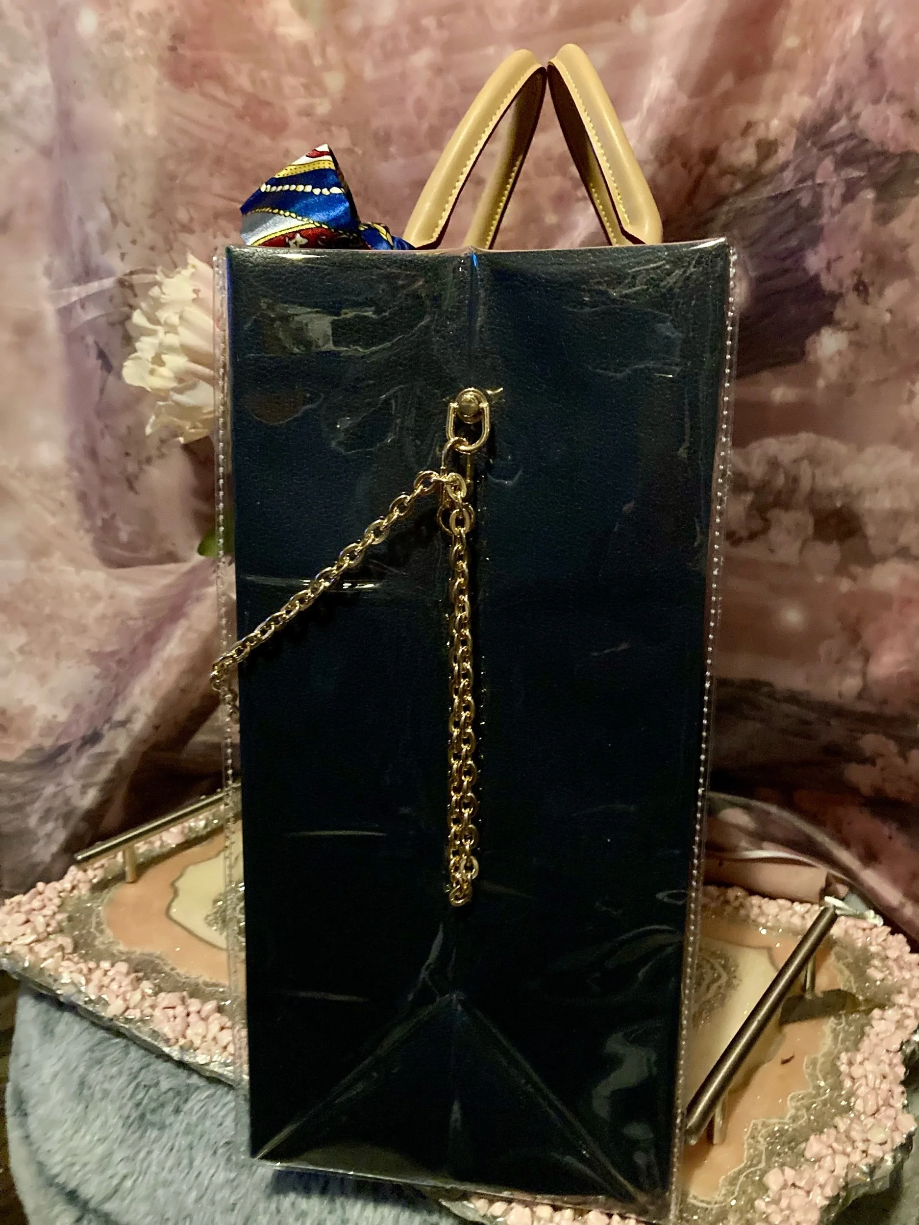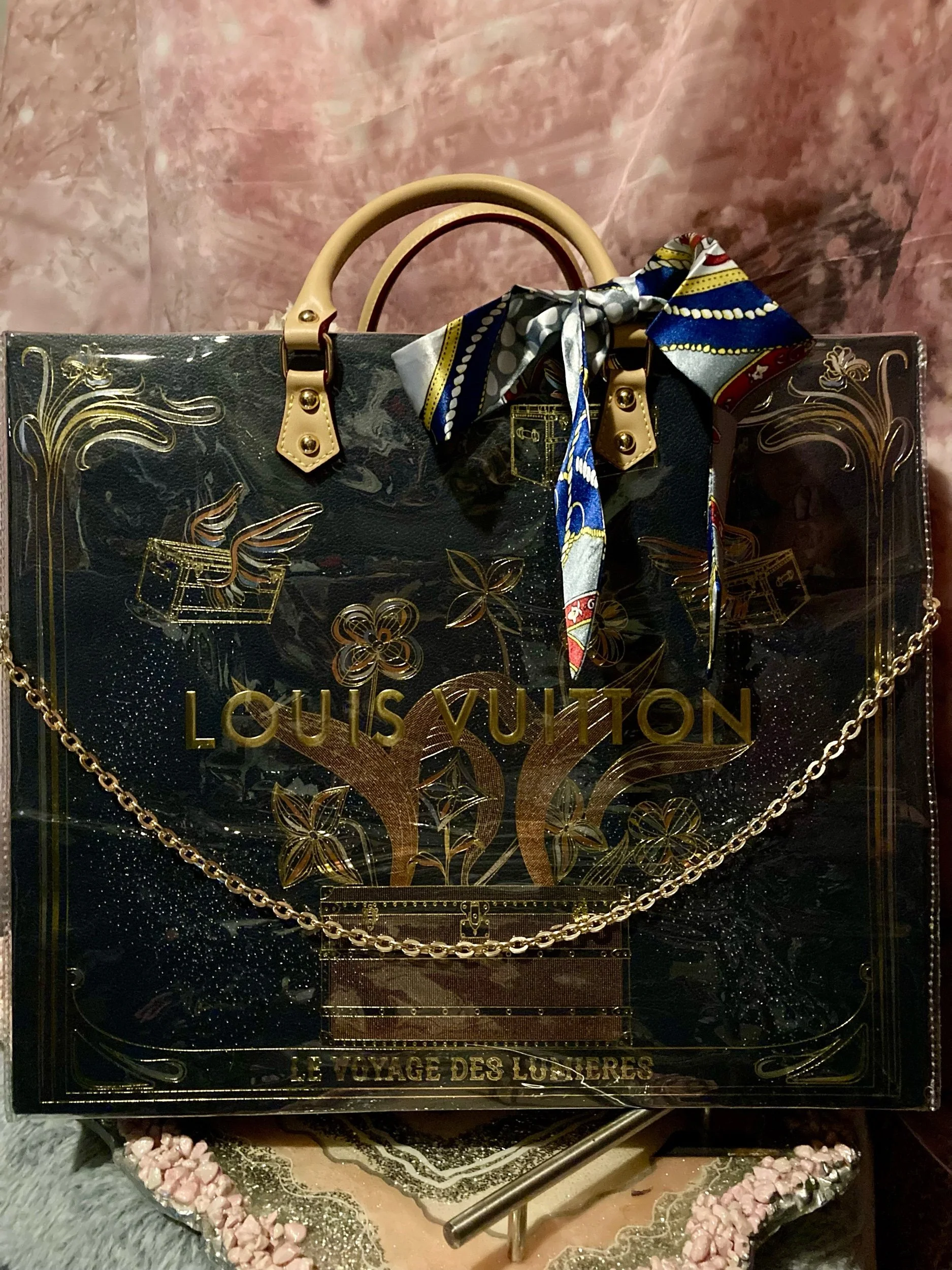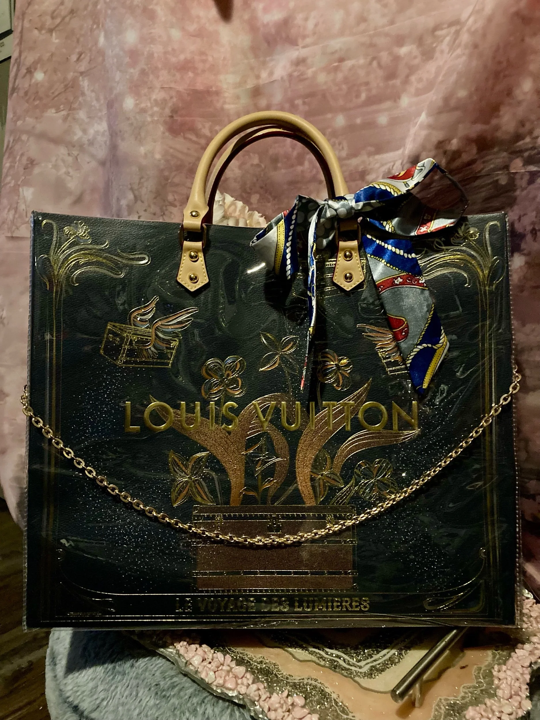 Shop › Custom Louis Vuitton Tote Image 1 of 5 Image 2 of 5 Image 3 of 5 Image 4 of 5 Image 5 of 5 Custom Louis Vuitton Tote $200.00 New custom done with handles , Twilly , and feet on bottom of bag w gold chain attachment Add To Cart Added! New custom done with handles , Twilly , and feet on bottom of bag w gold chain attachment